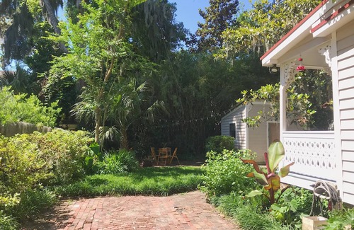 The one bedroom, one bathroom property highlights include a clawfoot tub with shower, a pull-out couch in the library for additional visitors and a tucked away, lush backyard with porch for relaxing in your own private oasis.