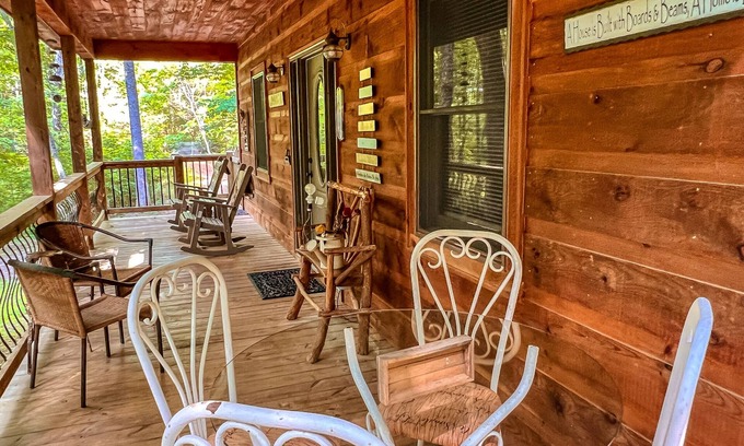 River Phoenix greets you with a rocking chair front porch and spacious gated wraparound porch and open deck to contain your pets while you relax. Listen closely and you will hear the babbling creek that runs beside the cabin. There is even an outdoor dining set so you can enjoy a morning coffee and breakfast on the deck.