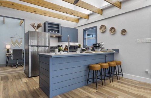 Our home sleeps 6 in this quaint 2 bedroom, 2 bathroom home. There are queens in both of the bedrooms and a sleeper sofa. Plenty of linens and towels. Full kitchen with a stocked coffee bar. There are smart tvs in all the rooms and wifi! We also have a wagon set up for you to make the trek down to the beach!
