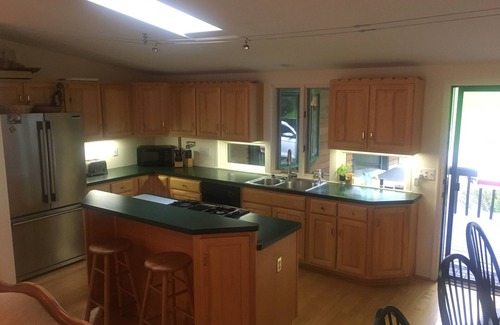 The house is maintained to a high standard because it is our family vacation home. Therefore it is only available for rent for 4-5 weeks per year. A wraparound deck allows you to enjoy the views and to move in or out of the sun as the day progresses. The house comprises four large bedrooms and three bathrooms. One King and two Queen bedrooms are on the second floor with the open plan kitchen/dining/living area and two bathrooms (one en suite); the kids' room is on the first floor with one bunk bed set (sleeps two) and one twin bed set plus the den/entertainment centre area and third bathroom. The plot is fairly level and allows access to main living area via two steps at rear and access to the permanent dock and boats by one step.