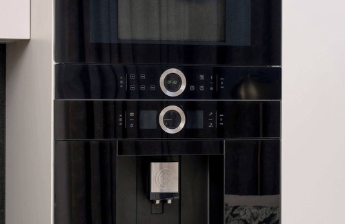 Oven, dishwasher, induction hob, extractor hood, pressure coffee maker, fridge with freezer, electric kettle, microwave, wine glasses, glasses, a set of cutlery and dishes.