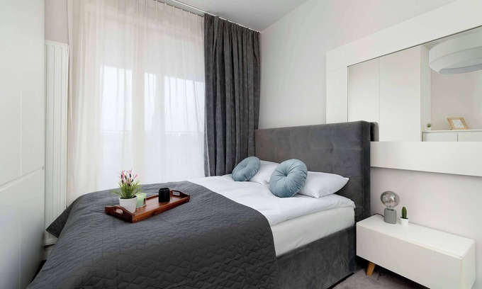 This stylish and elegant apartment is designed in a modern style, using neutral colors such as white, black, and shades of gray. This creates an interior that is both tasteful and harmonious. The property is designed for four guests, making it an ideal choice for families or groups of friends. The living room features a spacious, comfortable sofa that serves as the perfect spot for relaxation during the day and transforms into a functional bed in the evening. The spaciousness of the interior is further enhanced by large windows that let in natural light, creating a bright and pleasant atmosphere. For added comfort, the living room is equipped with air conditioning to ensure a cool retreat on hot days. From the living room, you can step out onto the balcony—a perfect place to unwind in the fresh air. The kitchenette is equipped with modern appliances, including an oven, microwave, induction hob, and a pressure coffee machine, making cooking a delightful experience. The bedroom offers a comfortable double bed, ensuring a restful sleep. A spacious wardrobe provides ample storage for all necessities, seamlessly blending with the rest of the interior design. The bathroom is fitted with a modern shower and a washer-dryer, offering full convenience, especially for longer stays. The apartment also includes a Smart TV with cable channels and free Wi-Fi, ensuring easy access to the internet. An additional convenience is the parking space in the underground garage, which enhances the overall comfort of your stay.