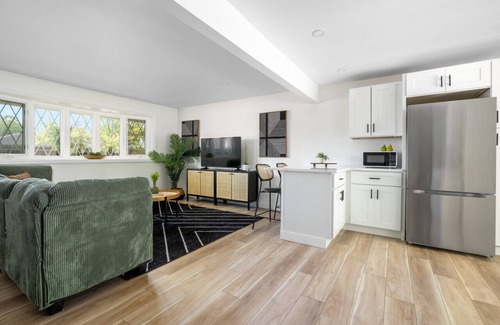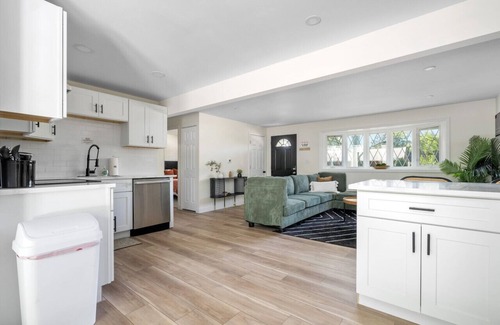 Guests may park on the street, in the driveway, or in the attached single-car garage. After entering through the front door into the entry space, you'll find an open living room with a comfy sectional and 50” TV and a bright white modern kitchen with granite countertops, stainless-steel appliances, and a peninsula complete with bar stools for enjoying homemade meals. Behind the kitchen is the entrance to the attached single-car garage, the spacious laundry room, and sliding glass doors that lead to the patio and fenced backyard. The large windows in the front, the sliding glass doors in the back, and the open-concept layout all come together to fill this home’s living space with natural light and a relaxed airy atmosphere.