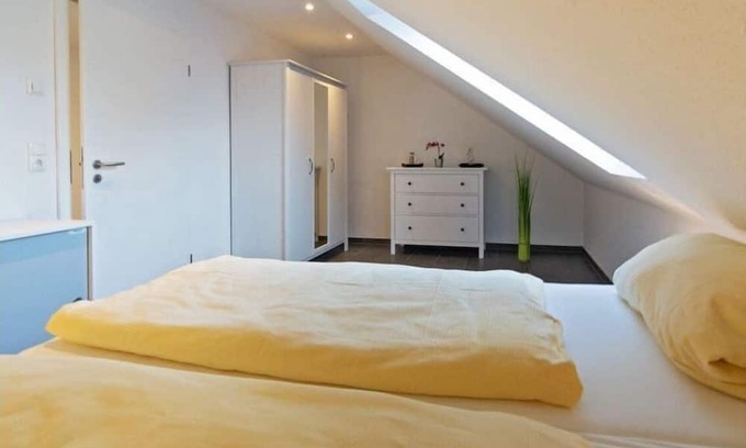 Holiday home Lucky The holiday home (semi-detached house) "Lucky" is located in a traffic-calmed residential area, which is close to the Norden-Norddeich railway line. The house is designed so that four-legged friends can go on holiday with their "masters and mistresses". A combination of living room/kitchen invites you to linger. Here you can cook, eat and make yourself comfortable. There are also dog blankets and baskets. You can reach the terrace via the living room. The 360-degree panoramic view offers a first impression. There are two bedrooms on the ground floor. One of them is equipped with a double bed (180 x 200 cm), which has separate mattresses. The furnishings are complemented by a built-in wardrobe. The second bedroom (right) has a single bed (80 x 200 cm). There are also two further bedrooms on the upper floor. Here too there is a double bed with separate mattresses and a built-in wardrobe. A cot, chest of drawers, bedside tables and alarm clock complete the whole. The second bedroom (left) has the same furnishings (without a cot). There are TVs here. The corner kitchen offers everything you need for a relaxing stay. Modern and functional, it is equipped with an oven, stove, coffee machine and pad machine as well as a refrigerator and microwave. There is also a dishwasher, toaster and the necessary dishes. The dining table, which can accommodate 7 people, is in the living-kitchen area. The bathroom on the ground floor has a shower, toilet, washbasin combination with mirror and hair dryer. There is a washing machine in the storage room. The second bathroom on the upper floor is furnished in the same way, only with a bathtub instead of a shower. Outside, you can make yourself comfortable on the terrace or in the garden (facing west). There is also a seating area waiting for you. The property is fenced in so that small children and dogs can move around freely. There are parking spaces next to the house. In the non-smoking apartment,
