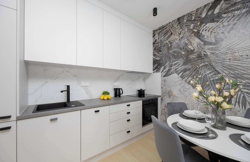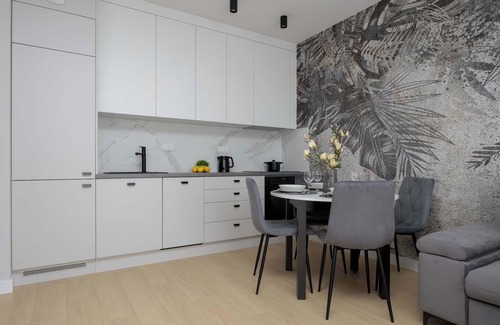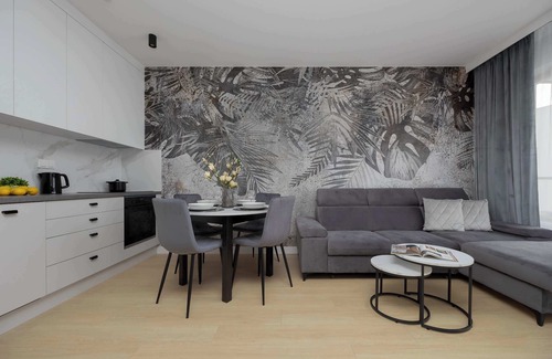 The modern apartment, designed for six people, offers space and aesthetics that are conducive to both relaxation and spending time together. Carefully designed interiors harmoniously combine subdued colors, subtle wall decorations and functional solutions, creating a place ideal for families with children and groups of friends. The focal point of the apartment is a spacious living room with large windows and access to the balcony, where you can breathe fresh air in the morning or relax after a day full of excitement. A comfortable sofa serves as a relaxation and sleeping area, and additional equipment allows you to freely use the space throughout the day. The living room is air-conditioned. Next to the living room there is an open kitchenette, which, thanks to its full equipment, allows you to freely prepare meals. Well-thought-out architectural solutions and high-quality materials create a coherent, elegant whole. Two bedrooms offer comfortable conditions for relaxation and privacy - one of them has a place to work or study, which will also work well in the case of a longer stay. The bright bathroom has all the necessary amenities for daily care, and the presence of a bathtub allows you to relax after an intense day. An additional utility room with a washing machine provides convenience for longer stays, allowing you to maintain order and independence. The whole is complemented by access to fast internet and a TV with Smart function, which allows for a moment of entertainment without leaving the apartment. Guests also have a parking space in the underground garage at their disposal. There is a possibility of staying with pets, which means that you do not have to give up the company of your pet while traveling.
