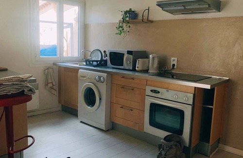 The kitchen is equipped with an oven and a refrigerator, as well as a coffee maker, an electric kettle, and a microwave. And you can even travel light because you'll have a washing machine. Other amenities include a sofa bed, bed sheets, heating, and a dining table.