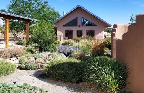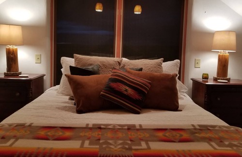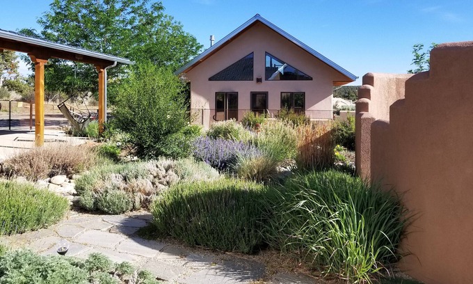 "Luna Mesa" is a beautiful unique modern architectural steel post and beam adobe straw-bale southwest home with a guest casita and studio which sits on 17 acres at the base of Mesa Verde National Park. A perfect special hidden gem, the "Moon Dancer" Guest Casita/Cottage accommodates one to four. Please note in our efforts to provide a safe stay we require guests, family, and friends to be vaccinated for Covid and we have been vaccinated. We follow strict Covid cleaning protocols as well. The cozy contemporary straw-bale adobe fully equipped casita/cottage with a full kitchen, dining area, 3/4 bath, loft queen bedroom, living room with a memory foam queen pull out sleeper sofa, gas fireplace stove and 4K Smart TV/DVD Player, will give you a special central location to experience the world of the Ancient Pueblo People and see all the wonderful sites in the Four Corners region of our beautiful Southwest. Sage Brush, Pinon, Juniper and Cedar on 17 private acres with forever views of the La Plata Mountains and Mesa Verde. The National Park Entrance Visitor Center is a short five-minute drive, less than 2 miles away. Luna Mesa is only 35 minutes away from the Durango & Silverton Narrow Gauge Train Station in Durango. The arts district community of Mancos, Cortez, Canyon of the Ancients, Hovenweep, Lowery Ruins, Four Corners Monument, Canyon de Chelly, Chimney Rock, Aztec Ruins, Bridges National Monument, Canyon Lands, Telluride, Arches National Park and Moab, UT are all within short drives from "Luna Mesa" in Mancos, CO. Touring and outdoors enthusiasts will enjoy the peaceful secluded location with a relaxing hot tub soak after exploring the region, that has forever mountain, mesa, and valley views as well as luminous moonlight and dark sky starry nights. Enjoy good food, beverages and entertainment at nearby Mancos, Cortez & Durango establishments. Mountain Bike at Phil's World Trail Park just 6 miles away! Hike high country national forest and Canyon of the Ancients trails. Fish nearby rivers and lakes. Ski Hesperus, Telluride, Purgatory and Nordic Trails within short distances. Events and special shows galore! All four seasons are beautiful! Come enjoy a true southwest experience from sage mesas, lakes, rivers, slick rock canyons to high 12 and 14,000 ft mountains.