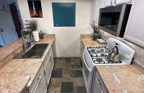 This unique vacation rental gives you the get-away-from-it-all experience while still having all your conveniences close by. Parking is FREE and close to the unit—just far enough away that you don’t hear people coming and going, yet close enough that carrying in groceries and suitcases is easy—it’s perfect. You also have your own private stacked, large capacity washer/dryer combo located inside the unit. Perhaps best of all, whether you visit in the winter, summer, spring or fall, the full-suite air conditioning and heating with auto thermostats will keep you comfortable throughout the entire home.