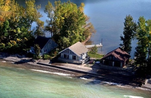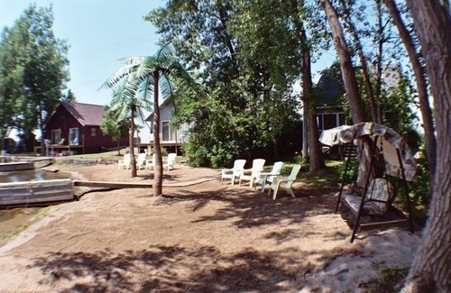 The front of the cottage sits on the beach with Lake Ontario rolling in the waves. There is a deck with a bar and stools for enjoying a cocktail at sunset or something to eat during the day. Between the deck and the Lake is a raised sandy beach for playing in the sand or getting some sun. Large boulders protect this beach from the waves if the lake gets rough. Plenty of body surfing and swimming in the Lake. The Lake has a sandy bottom and there are no drop offs so its great for you and the kids. The back of this wonderful cottage sits on Sodus Bay with a raised sandy beach and two palm trees . There is a 16 x 24' deck with an outdoor kitchen 10 x 6' which includes a Weber gas grill. There is a fire pit and picnic table. The entire yard is beach sand. The water is calm and great for swimming and fishing, water-skiing, and all kinds of water sports. There is a floating dock and great fishing from the dock.