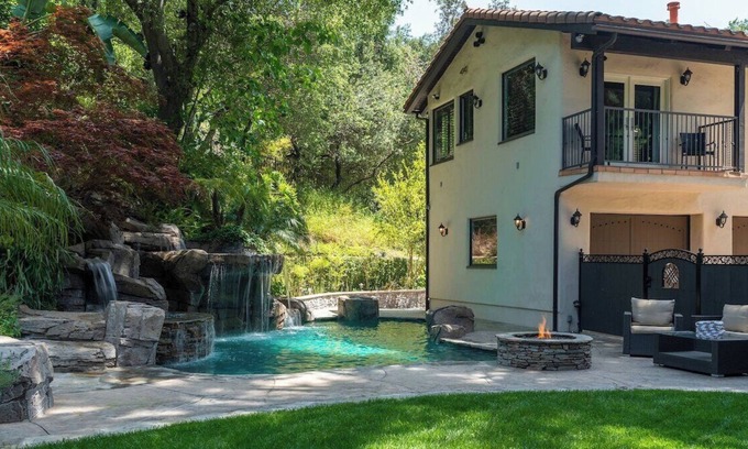 This gorgeous Mediterranean mansion comes with 5 bed / 5 bath, lush outdoor area including a pool and hot tub. Enjoy the fully stocked gourmet kitchen, child friendly amenities , washer/dryer, arcade games, and a secluded hiking trail right in the back yard!