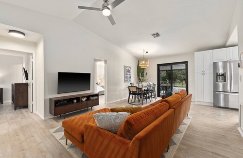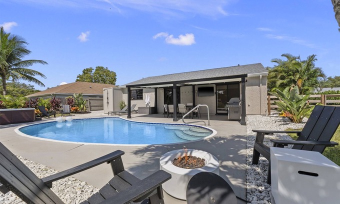 Discover this stylish 3-bed, 2-bath vacation home in Port St. Lucie, FL, designed for coastal relaxation. Enjoy a dip in the crystal clear pool, or unwind in the bubbling hot tub while observing serene nature & wildlife views. Smart devices play your favorite tunes while prepping your morning coffee or for afternoon barbecues. Nestled in the privacy of lush tropical greenery, you're only minutes from premier golf courses or the ocean surf at sandy Jensen Beach. Experience your perfect getaway!