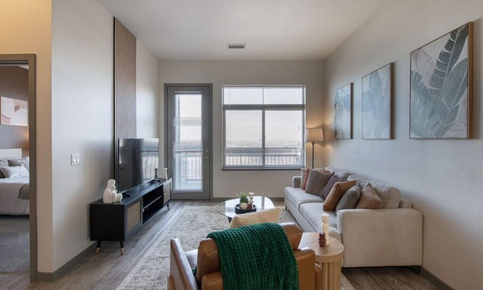 This fully furnished luxury 2-bedroom apartment features a queen bed and a double bed, in-unit washer/dryer, smart thermostat, central AC/heating, a large equipped kitchen, two smart TVs, a built-in desk, and high-speed internet. Amenities include a rooftop deck, heated pool, hot tub, gym, pet wash, secured garage, and entertainment areas. Pet-friendly ($100/month per pet). 30-day minimum stay. Background check ($40 per applicant) required. Safe, central location near shops and transit.