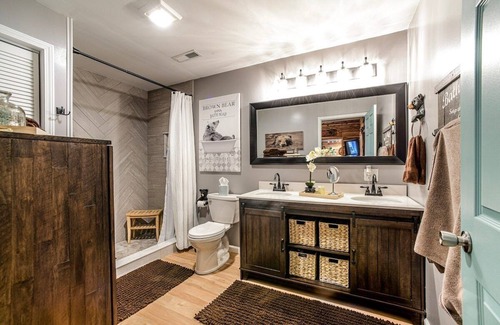 Cedar Hill Lodge at Pine Hurst Bay. Remodeled 2bed 1bath. 5 min to Nolin Lake (Wax Marina) & 40 min to Mammoth Cave. Modern farm design, cedar walls, luxury linens, hot tub, firepit, bourbon themed game room w special edition Jim Beam pool/ping pong table, Pacman & karaoke. 30 ft covered front porch w/ dining/conversation area. Fully equipped kitchen, memory foam mattresses and intelligent TV's. Back patio includes a Blackstone & gas grill.