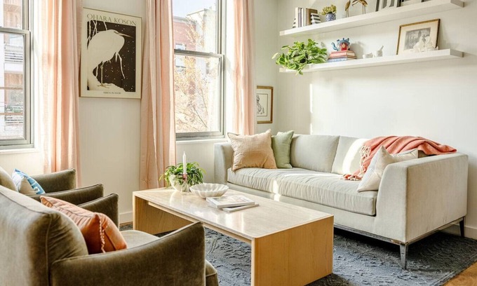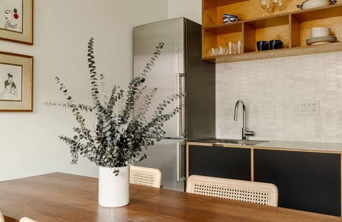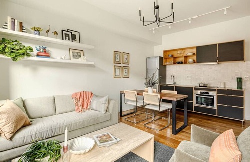 You'll also notice the gorgeous, airy light streaming into the living room and kitchen, which are located in the front of the property. The space has been thoughtfully and tastefully curated with art, decor, and high-end furniture.