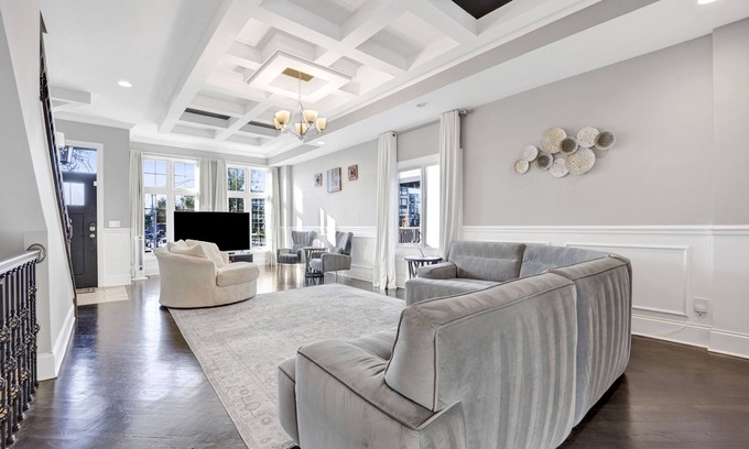 This spacious 4 bedroom 3 1/2 bathroom property, featuring high ceilings on each floor, including the basement, comfortably sleeps 8 adults. The master en suite features south facing windows for natural sunlight and a spacious walk-in closet, with a designer bathroom. Throughout the house, are ultra modern design elements like the custom ceiling to floor stone wall paneling with digital fireplace, hardwood flooring, and intricate ceiling designs.
