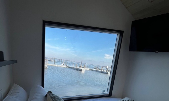 Unit remains docked at SoLSTAY Marina on Lake Erie's Castaway Bay. It is furnished with a queen bed, 2 modern reading chairs, a side table, a mini fridge with counter space and a large TV. Chairs can be taken in and out of the unit to enjoy the front viewing deck. This is a tiny houseboat located directly on Lake Erie. Each boat is unique. You will have to walk off the boat to use the restroom facilities and other amenities.