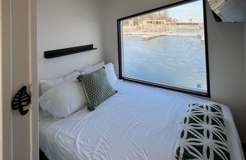 Unit remains docked at SoLSTAY Marina on Lake Erie's Castaway Bay. It is furnished with a queen bed, 2 modern reading chairs, a side table, a mini fridge with counter space and a large TV. Chairs can be taken in and out of the unit to enjoy the front viewing deck. This is a tiny houseboat located directly on Lake Erie. Each boat is unique. You will have to walk off the boat to use the restroom facilities and other amenities.