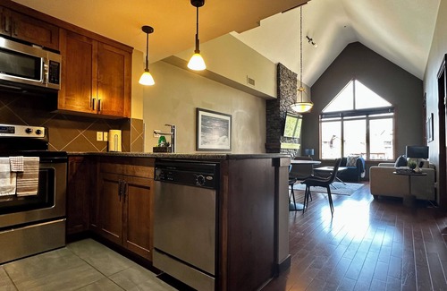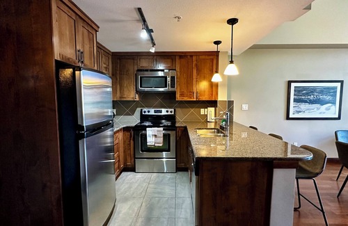 An amenity-rich top floor suite featuring cathedral ceilings, amazing mountain views, plenty of living space and a beautiful kitchen. The suite is located in the luxurious Stoneridge Resort that has a year-round heated pool and hot tub, underground parking with 2 EV chargers, fitness area and Black Dog Cafe. It is located only a few minute walk from Downtown Canmore and only a 20-minute drive to Banff. We welcome you to come enjoy a truly beautiful stay with us! The fully equipped kitchen features granite countertops, breakfast bar with seating for 3 and a separate dining table for 4. The living room features a stone faced gas fireplace with a large TV and a queen size pull out couch. The patio, accessed either through the living room or the bedroom, has magnificent view of the mountains and oversees the pool/hot tub courtyard. The bedroom offers a king size bed and is attached to a huge bathroom, with a two door access. The whole suite is cleaned and disinfected thoroughly to ensure a safe and enjoyable stay.
