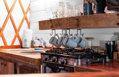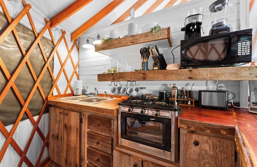 The sky view yurt at Brush Creek Retreat is such a beautiful unique way to experience the Buffalo River area. This yurt is equipped with everything you need to be comfortable and cozy. Perched fourteen feet off the ground, the yurt deck offers a beautiful view of the grounds below and Brush Creek. The round shape allows you full view of the entire inside area. Stepping into the Yurt you immediately notice a large sky light above perfect for letting in natural light and star gazing. The yurt sits on a large deck platform which allows you room to walk around the entire structure. What a nice way to spend an evening under the stars. As you walk inside the yurt you are welcomed by a nice living room with a full size sofa bed and a queen size sleeping area. An Island bar borders the kitchen. Behind the bar is a kitchen with a small two burner stove, a wine fridge, sink, and a refrigerator. The kitchen is stocked with dishware and plenty of utensils to cook a nice meal. Off of the living area is a nice size bathroom. Outside you can enjoy a large wrap around deck, and grill area. A unique fire pit and boulder hot tub create an amazing experience. Swim in the creek bordering the property or just relax on the creek bank. This place has it all.