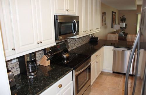 Enjoy the fully equipped gourmet kitchen to prepare family meals which opens up to the living room. The open design has an integrated breakfast bar complete with bar stools for casual dining at the kitchen or a perfect conversation area for entertaining. The patio and its furnishings are under shade for most of the day and is an ideal location to cool off, have a cup of coffee, or enjoy a cook out.