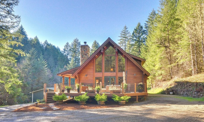 Set on 30 private acres of forest and just a short walk to Henry Hagg Lake, this enchanting log cabin is the perfect place to call home on your next trip to the Gaston area. You'll fall in love with this upscale vacation rental's magazine-worthy interior fitted with 3 bedrooms, 2.5 bathrooms, a modern kitchen, and a stone fireplace. Then, step outside to recline on the deck, hike from the home into the woods, or head out to experience Oregon's wine country by touring endless local vineyards.