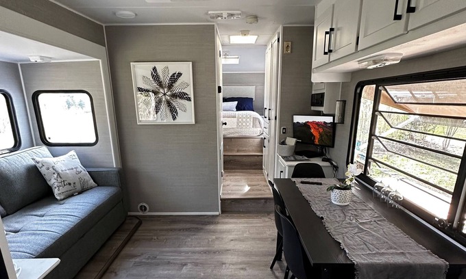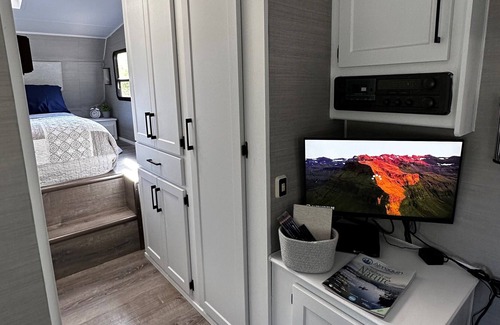 Enjoy a camping experience like no other! This beautiful RV provides all the luxuries of home while set in the beautiful surroundings of nature. Enjoy a walk on the 50 acre property, spend the evening by the campfire, enjoy a meal at the picnic table. However you choose to spend your time here, you will love the options and surroundings of this unique campout. A little taste of luxury on the inside, all the joys of camping on the outside. We invite you to enjoy our uniquely created oasis.