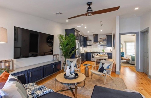 This carriage house can fit up to 4 guests with its 2 bedroom, 2.5 bathroom, and walking distance to Savannah’s historic district. With its modern amenities, including a shared heated pool that can fit up to 8 people, this home is great for those exploring Savannah. The professionally designed spaces offer open-concept layouts and kitchen & dining spaces perfect for entertaining.