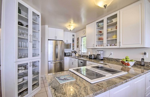 KITCHEN: Fully equipped, tile floors, built-in counter stovetop, stainless steel refrigerator, coffee maker, convection oven, microwave, toaster, cooking essentials, knife set, dishware, glassware, silverware