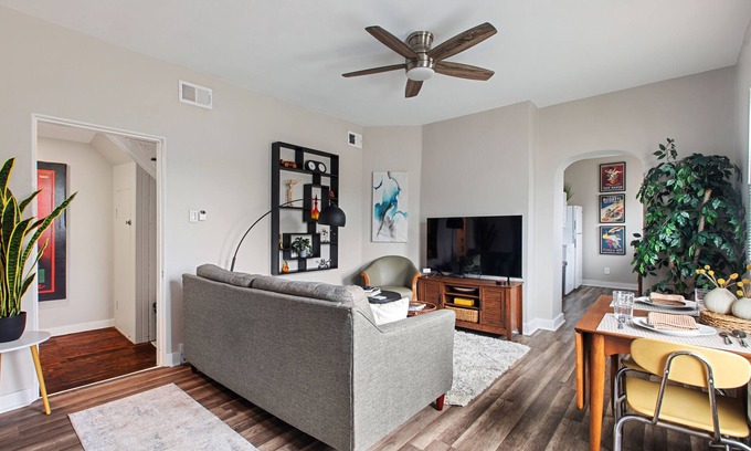 This spacious, artsy 3 bedroom 2 bath walkup is in the heart of Pittsburgh's iconic Southside neighborhood. Three comfy bedrooms boast sleeping arrangements for eight, plus dedicated workspaces. The house is two short blocks from Carson St.- home to Pittsburgh's best eateries, shops, & nightlife. And it's close to the riverfront, where bike & walking paths beckon. The decor mixes authentic vintage & modern pieces plus original art to create a space with a unique style. You can watch the 4K smart TV, get some work done with high-speed fiber WiFi, cook in the efficient kitchen, or hang out on the shared patio or covered private porch.
