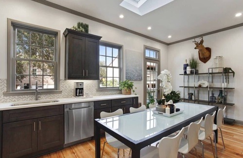 This home and carriage house combo can fit up to 14 guests with its 6 bedroom, 5 bathroom, and walking distance to Savannah’s historic district. With its modern amenities, including a heated pool that can fit up to 8 people, this home is great for those exploring Savannah. The professionally designed spaces offer open-concept layouts and kitchen & dining spaces perfect for entertaining.
