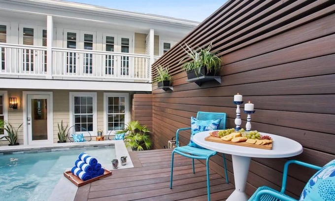 Outdoor Space: This listing has a private heated cocktail pool that can fit up to 8 people. The pool area includes a sitting area and an outdoor dining table.