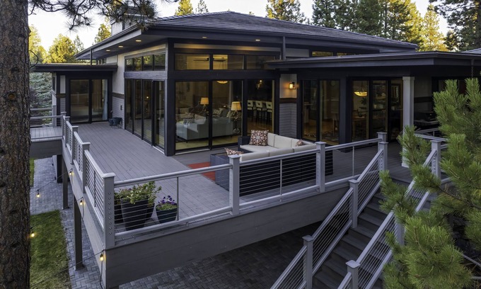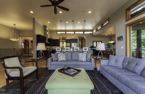 The modern dining room can host up to 10 people with a large kitchen and covered gas grill. An expansive living room and gas fireplace set a nice backdrop to the 12' windows looking out at ponderosa pine trees, Aubrey Butte, and the occasional views of Mt. Jefferson.