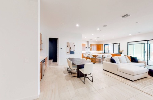 When you need an escape from the heat, step inside and sit down on the oversized sofa in the living room. Catch up on your favorite shows here or head for the in-home theatre, dark and spacious, ideal for movie nights. The home's gourmet kitchen has it all - stainless steel appliances, a center island, a six-burner stove, ample meal prep space, and a separate bar with a wine fridge, and ice machine.