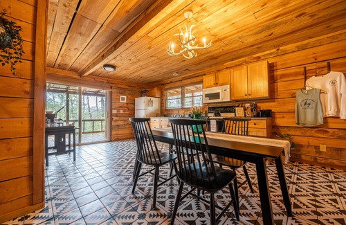 One of the highlights of our cabin is the spacious wrap-around porch, where you can unwind and take in the panoramic views of the forest, it's the perfect spot to gather with loved ones whether on the front porch in the rocking chairs or out back in the hammock or patio furniture. Enjoy a game of checkers or corn hole.