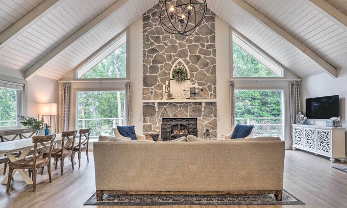 INDOOR LIVING: Smart TVs, 6-person dining table, stone fireplace, hardwood floors, open floor plan, vaulted ceilings