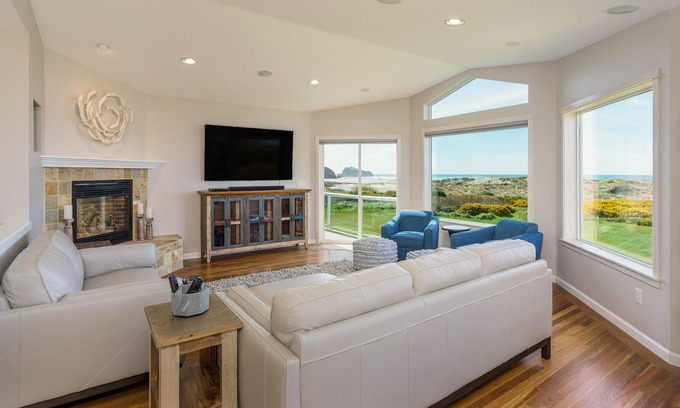 Discover the magic of the Oregon Coast from this modern, oceanfront gem. Teeming with thoughtful, high-end touches and designed with group comfort in mind, this four-bedroom stunner is sure to build lasting vacation memories. Just an easy drive from renowned, Bandon Dunes Golf Resort, enjoy a peaceful dune-front location offering sweeping views of Haystack Rock and the ocean. Upper and lower level decks allow guests to take full advantage of ocean air and views. Make the most of blue sky days with a coastal barbecue using the private gas grill.