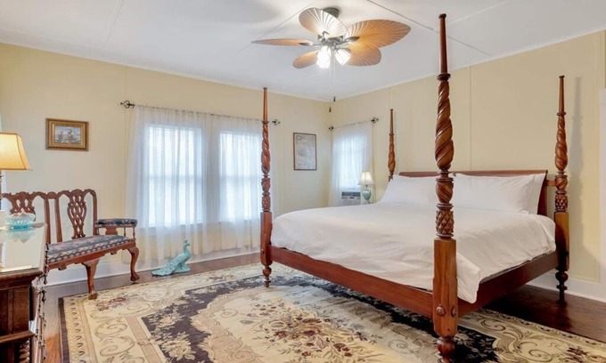 Escape your busy life to find solitude in this Historic private 3,444 sf home nestled on 2.5 acres. Each room has been turned into its own beautiful suite and rented separately. This bedroom has a shared bathroom in hallway that rests on the second floor and has private access from inside the home. Originally built by Pole Mason Coussons (banker) and his wife Carrie A Nethery Coussons in 1910, the manor is completely immersed by astounding views, and it’s difficult to not feel you found the perfect getaway!