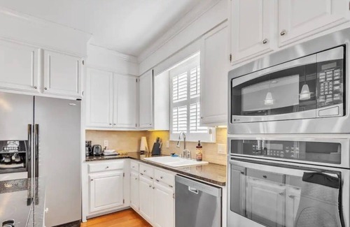 Fully appointed kitchen with stainless steel appliances, including stove, oven, refrigerator, dishwasher, and microwave. Bedrooms are comfortably furnished with beautiful crisp new linens, pillows, and bed coverings. Master bedroom features an en-suite bathroom with a walk-in shower and private walk-in closet.