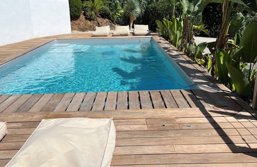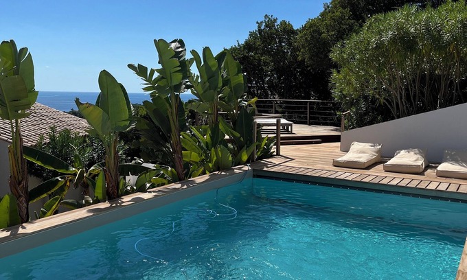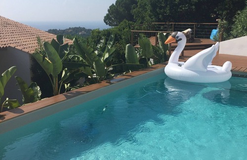 Villa renovate in July 2017 by a interior designer with its swimming pool and its 40m2 teak terrace and an exceptional view of the sea. Close to the beaches ( next to Landing beach and close to Saint Tropez beaches Pampelone ) luxury villa, great comfort, high quality furnishings, it is a luxurious villa in a quiet residential area close to all amenities.