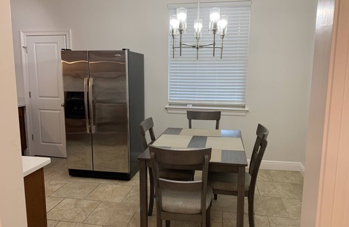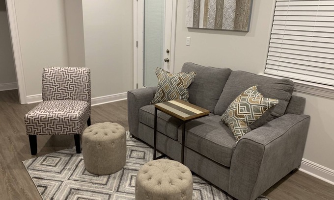 Recently renovated 2 bedroom, 1 bath 2nd floor apartment in Midtown. All new luxury vinyl plank flooring, custom walk in shower with rainfall shower head and handheld sprayer, quartz countertops, walnut cabinets with soft close feature, custom marble backsplash, recessed lighting, remote ceiling fans, upholstered queen beds with 12" memory foam mattresses, stainless steel appliances, keyless entry, USB ports in kitchen, den, and bedrooms, two 49" smart tv's, wifi and cable in the den.