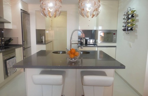 Brand new and modernised elevated frontline spacious modern and luxurious 3 bed penthouse (sleeps 8) with massive outdoor terrace for al fresco dining with sunbeds, 8 seater covered dining area and a further sofa area with spectacular sea and golf course views and all day round sun. There is direct access to the enclosed children friendly communal gardens via the lift and 2 large pools, one adult, one childrens (with a further 7 communal pools in the complex) with sunbeds and umbrellas. Underground parking with lift straight to apartment door and 24hr security entrance. Puerto de la Duquesa is a pretty cosmopolitan marina which stands between 2 blue flag beaches situated between Gibraltar and Marbella with Malaga only 45 minutes away by car. The marina itself has numerous bars and restaurants with a wide choice of international cuisine. Bordering Duquesa is the larger resort of Sabinilla's, which has a very Spanish feel and where you can sample tapas in one of it's many Spanish restaurants or bars along the promenade or simply soak up the sun on the golden sandy beaches, that run as far as the eye can see. For the golfers among you, you will find several award winning golf courses within easy driving distance of the complex, the Duquesa Golf complex being the nearest which is just 2 minutes away.