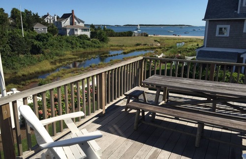 This luxurious four-story home has breathtaking views of the boats and ferries on Lewis Bay. The house is beautiful, well-furnished, very comfortable and sparkling clean. It sleeps 15 guests in six bedrooms plus a family room/seventh bedroom. Perfect for a family reunion, families of friends sharing a vacation, or a reunion of 15 friends. Everyone in real beds, with real mattresses, and great, cotton linens. No one has to sleep on a futon, sofa bed or bunk. Cribs are available for infants or young toddlers. The semi-private beach - with warm, shallow water, perfect for kids - is a few yards from the front door. Bayview Beach is around the corner. Renovated top to bottom, this house is a dream with modern amenities and the utmost in comfort. Wood floors throughout. Central A/C plus ceiling fans in every room. WIFI, cable TV, marble kitchen countertops, Keurig coffee brewer, marble/tile bathrooms, comfortable mattresses and good quality linens, original artwork, a sound system, a family/TV room (with two daybeds), large laundry room w/ big new W/D, outdoor gas grill, picnic tables, outdoor shower w/ dressing area, three decks and a patio, parking. The grounds are beautifully landscaped with hydrangeas and rose bushes. There is a small lawn where children can play. The house is walking distance to the Nantucket ferries, and about a mile's walk from downtown Hyannis.