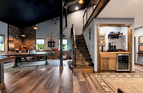 The main lodge offers serene sleeping arrangements with a king master suite, multiple queen bedrooms, and spacious shared living areas that open up to jaw-dropping mountain views. The apartment provides an intimate, stylish haven for couples or small families, with open-plan design, a private deck, and a cozy queen bed plus sleeper sofa. Meanwhile, the entertainment house is pure fun, boasting a game room with pool and ping pong tables, a poker/card table, full bar, and an incredible indoor fish tank for a unique touch of tranquility.