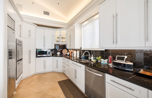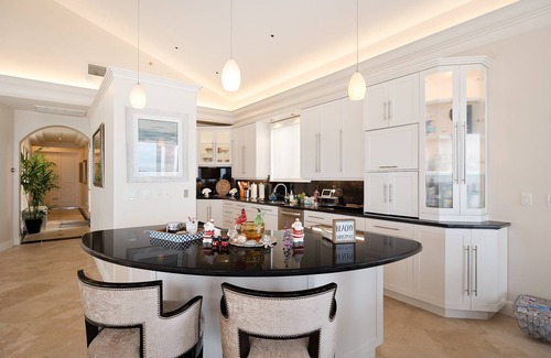 The main living area is tastefully decorated, open & spacious with a high vaulted ceiling. Take a seat on the cozy sectional sofa and enjoy unobstructed views of the beach and Gulf of Mexico. Once you're done soaking in the views, take a seat on the leather couch to enjoy some entertainment on the large flat screen TV. The kitchen and dining area are conveniently adjacent to the main living area. There's seating for 8 at the dining table, plus additional seating for 2 at the bar. The kitchen area comes fully stocked with all pots, pans, utensils, and appliances you may need to prepare a delicious meal!
