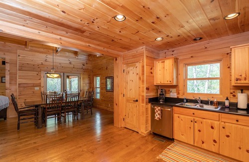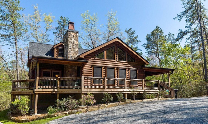 The cabin is surrounded by a large wrap-around deck with a large built-in bench, a large outdoor dining table, and plenty of rocking chairs and Adirondack chairs. The front porch boasts rocking chairs, as well as a porch swing. Also provided are a charcoal grill, and a fire pit area with a large Cowboy Cauldron.