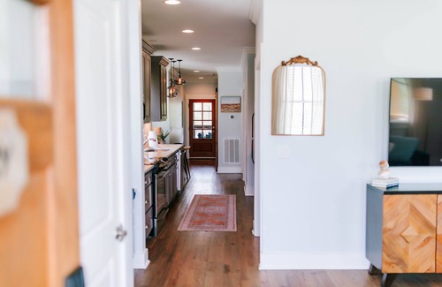 The modern galley style kitchen and dining area offer plenty of room to comfortably host intimate dinners and are outfitted with all the cookware, dishes, utensils, dishwasher pods, and appliances you will need to cook delicious meals. The inside dining table can seat up to four, and there is also dining seating for eight on the back porch.
