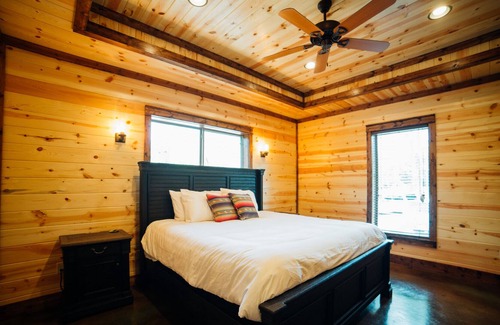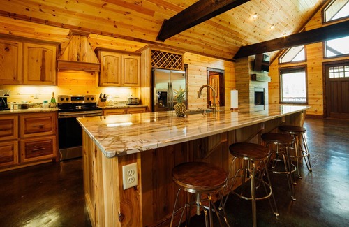 This luxury cabin, has a superb open-concept layout that is designed for ultimate entertainment and family hour. Perfect size for families and friends vacationing together! Surrounded by soaring pine trees, your children will be over joyed in the outdoor adventures and turfed playground that await them. Inside, the cabin features gorgeous stained concrete, exposed beams, a game room that will not disappoint, and all the amenities necessary for the ultimate family vacation experience. The open living area is ideal for entertaining, socializing, holiday get-togethers and more! The kitchen features an oversized island made out of state of the art Brazilian quartzite countertops, plenty of storage space and is fully equipped with all of the necessary cooking appliances to whip up your favorite family recipes. During your stay, you will be able to relax in comfort and style. The 2 master suites offer plenty of room for Mom and Dad to enjoy some peace and quite. Both rooms feature beautiful wood king size beds. The Bonus room is one of a kind! It features 4 full-size built in beds. It also includes a flat screen TV and plenty of games for the kids to enjoy. You'll be able to wind down with a glass of wine next to one of the two, hand-cut stone fireplaces while the kids are watching a movie on any of the 6 TV's. The cabin also has wireless internet access to keep you up-to-date with news and allow you to share your fun adventures with family and friends during your stay. Sipping coffee on the spacious back porch and enjoying the serene environment will be your favorite part of the day! With over 750 sq ft of additional space, entertainment is what it is all about. A beautiful Jacuzzi that fits 10, an outdoor kitchen space and another hand-cut stone fireplace are just a few small details of the outdoor experience this cabin has to offer. This cabin is conveniently located just a half of mile west of Highway 259. During your stay, you'll enjoy perusing nearby attractions and entertainment at local shops and restaurants. You are minutes away from downtown Hochatown, Broken Bow Lake and Marina and the beautiful hiking trails of Beaver's Bend State Park. During the summer time, enjoy the beautiful shores of Broken Bow Lake that is just 4 short miles from the cabin. An outdoor enthusiast's dream, you're always just a short jot from numerous biking and hiking trails. For the fisherman in your life, Beaver's Bend State Park has some of the most gorgeous fresh water steams for trout fishing. For the kiddos, Hochatown offers an array of entertainment. From go kart rides, a petting zoo, miniature golf and paddle boats, the kids are sure to have a blast! Cedar Creek Golf Course is a short drive away and offers beautiful greens surrounded by large pines trees. No matter how you choose to spend your time in Hochatown, you're sure to have a memorable vacation while staying at this luxury cabin!