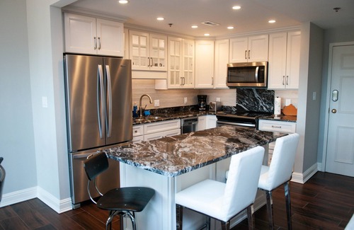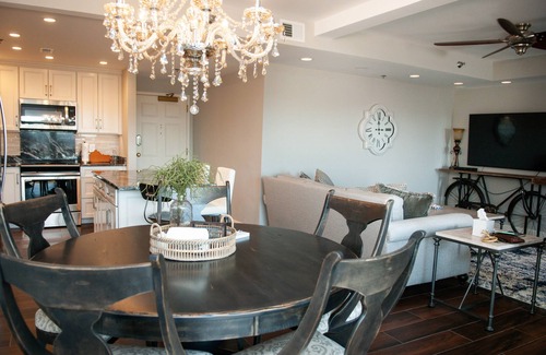 Enter the condo through our updated kitchen, which features granite countertops, stainless appliances and an oversized island for entertaining. The open concept kitchen flows into to our comfortable living room with a plush sofa and chairs, a cozy nook with additional seating where you can enjoy looking out on the city through the sliding glass doors. This area also includes a massive dining room table and chairs and a den area with a desk.