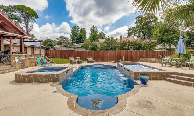 Experience luxury in our 5,500 sq ft estate located in DFW, only minutes away from downtown Dallas and major stadiums. This private retreat offers five bedrooms, a state-of-the-art entertainment system, and surround sound throughout. Enjoy a resort-style pool with a palm tree ambiance, hot tub, and an outdoor kitchen with fire pits. Ideal for families or retreats, it's the perfect blend of comfort and convenience for an unforgettable experience. Indulge in luxury with us!