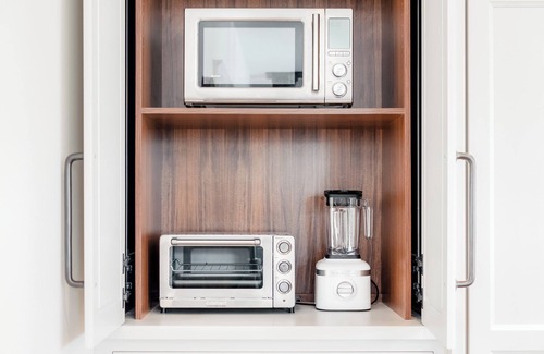 -Kitchen: Chefs kitchen with a Wolf gas stovetop and oven, Sub-zero refrigerator/freezer with ice machine, Moccamaster coffee maker, microwave, blender, crockpot, and toaster oven. Various spices, S&P, olive oil, and kitchen essentials at your disposal.